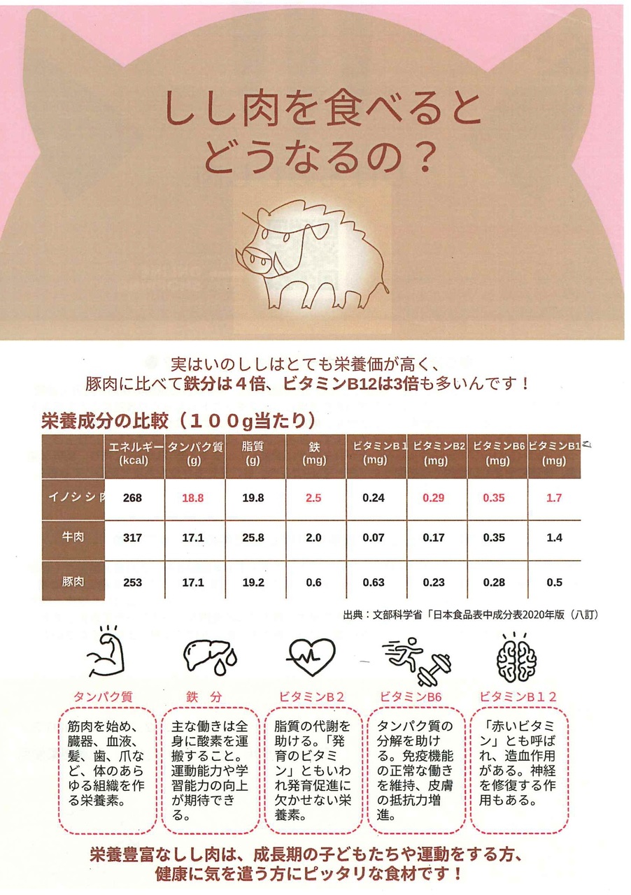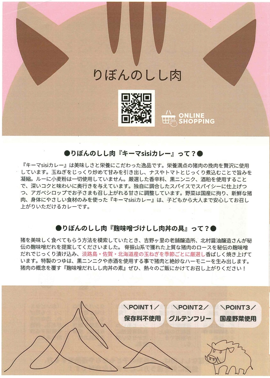 調理しづらいしし肉だが、猟師兼栄養士がしし肉のおいしさを最大限に引き出し、調理したキーマカレー。ふんだんにスパイスを使用しているが、子どもでも抵抗なく食べることができる辛さに調整。ボイルするだけで本格的なしし肉カレーが簡単に味わえる。