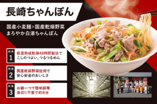 国産小麦粉と国産乾燥野菜の安心感を重視し、時短しながら外食級の満足と栄養が摂れる野菜ちゃんぽんです。自宅でも本場の味を楽しめる一品となっています。